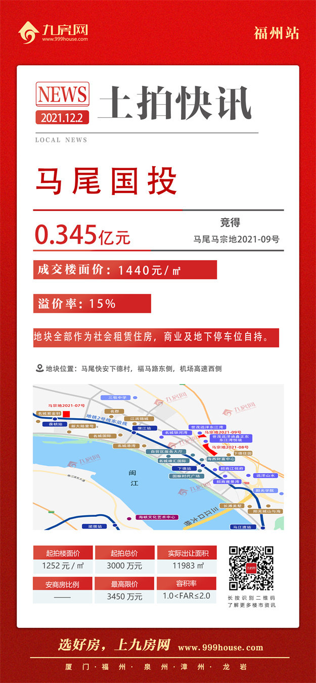 仅闽侯榕发和马尾国投报名,最终,被马尾国投摘下,总价0.345亿元,成交楼面价1440元/㎡,溢价率15%。